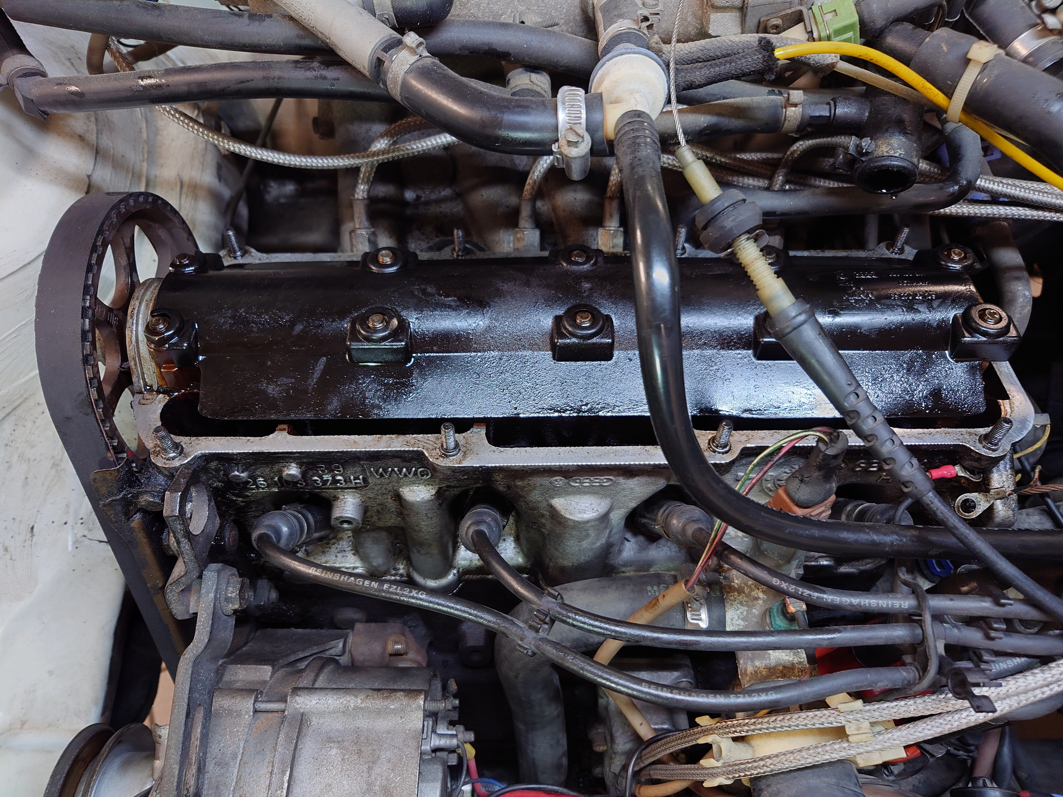 September: Kamrem, vattenpump, termostat, uppgradering av ventilkåpans packning (från kork till gummi), rätt aux-rem. Detta var nog final touch för att bli av med hackandet vid full gas, nu går den som en klocka!